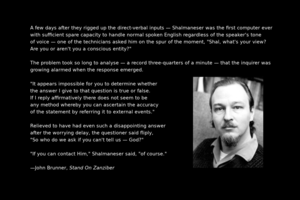 A few days after they rigged up the direct-verbal inputs — Shalmaneser was the first computer ever with sufficient spare capacity to handle normal spoken English regardless of the speaker's tone of voice — one of the technicians asked him on the spur of the moment, "Shal, what's your view? Are you or aren't you a conscious entity?"