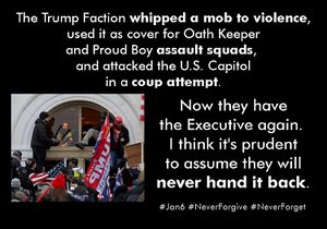 The Trump Faction whipped a mob to violence, used it as cover for Oath Keeper / Proud Boy assault squads, and attacked the Capitol in a coup attempt.
