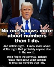 | 08:07, 28 February 2026 | No one knows more about numbers than Donald Trump.jpg (file) | 81 KB | No one knows more about numbers than I do. And dollars signs. I know more about dollar signs that probably anyone else in the world. Don't forget the commas. Nobody knows more about using commas to separate numbers than I do. * [https://bsky.app/profile/gnomonchronicles.bsky.social/post/3mfwimsmq4c2s Post] @ Bluehost (28 February 2026) {{Fiction}} {{Essays}} {{Donald Trump}} Category:Numbers (nonfiction) | 1 | |